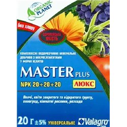 Вес пакета 20 гр. Мастер люкс 20+20+20 - комплексное водорастворимое минеральное удобрение с микроэлементами в форме хелатов. Данное соотношение NPK, специально сбалансированных для питания различных видов растений на всех стадиях развития. Удовлетворяет все потребности растения в питательных веществах, стимулирует активное и длительное цветение, повышает...