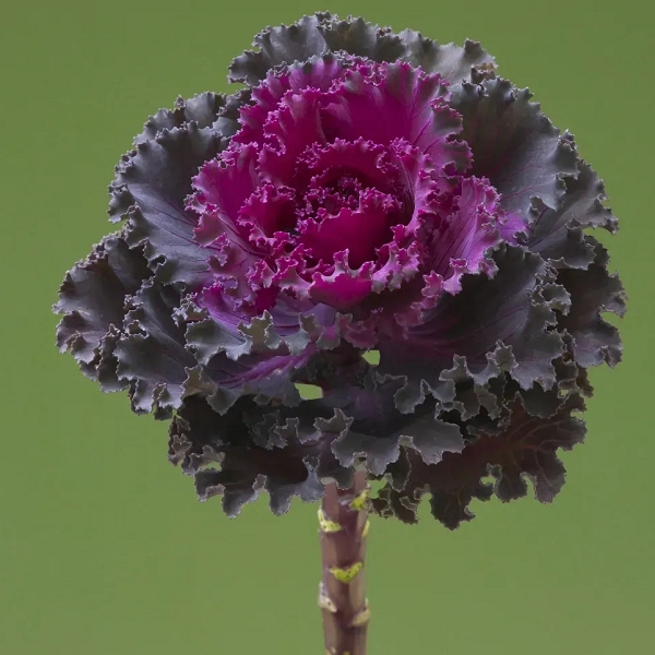 Капуста Крейн Раффл F1 (Brassica oleracea Crane Ruffle F1). Гибрид декоративной капусты с экстравагантными, бахромчатыми листьями. Выращивают на срез для создания необычных букетов. Высота растения 60-90 см. Характеризуется равномерным вертикальным ростом стебля и компактными соцветиями, размер которых можно регулировать с помощью расстояния между ними. Долгое время сохраняет декоративность в вазе, что делает ее отличным выбором для флористики. Светолюбивая, холодостойкая, влаголюбивая культура. Предпочитает легкие, хорошо дренированные, плодородные почвы. На рассаду семена высевают в конце марта – начале апреля, непосредственно на постоянное место в мае – июне. Уход за декоративной капустой несложный и подразумевает регулярные поливы, подкормку и рыхление почвы при необходимости.