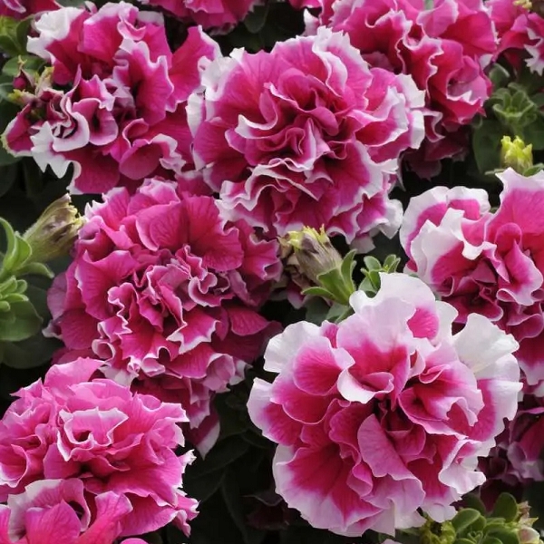 Петуния грандифлора махровая Пируэт F1 (Petunia double grandiflora Pirouette F1). Изысканная махровая крупноцветковая петуния. Кусты компактные, хорошо разветвленные, высота 25-40 см, ширина 25-30 см. Сочетание двух цветов, высокая степень махровости и большие размеры цветка, диаметр 7-10 см, сделали эту петунию всеобщей любимицей. Отличается ранним, обильным цветением, повышенной стойкостью к неблагоприятным погодным условиям и способностью длительное время сохранять яркость расцветок. Выращивают рассадным способом. Посев проводят в конце февраля-марте. Семена петунии равномерно рассыпают по поверхности хорошо увлажненной земли, сбрызгивают водой из распылителя и накрывают стеклом или прозрачной пленкой. Всходы появляются через 7-12 дней. Пикировку проводят в фазе двух настоящих листьев. Рассаду высаживают на постоянное место, когда минует угроза заморозков. Используется для посадки на клумбах, рабатках, бордюрах, в балконные ящики и вазы, хорошо выглядит в подвесных кашпо.