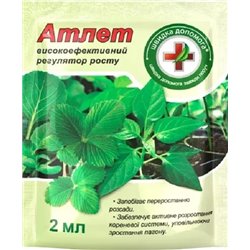 Вага 2 мл. Атлет – препарат, який тимчасово призупиняє верхній ріст та стимулює розвиток бічної тканини – пагін не подовжується, а потовщується. Уповільнення росту надземної частини пошкодження до потовщення стебла, формування більшої листкової пластинки, посиленого коренеутворення. У рослину препарат проникає через листя (обприскування) або коріння...