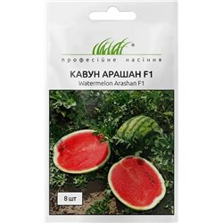 Насіння в пакеті 8 шт. Арашан F1 – ранній гібрид кавуна типу Кримсон Світ, період дозрівання 64-68 днів. У гібрида дуже потужна коренева система, міцна рослина, а також підвищена стійкість до сонячних опіків. Червона дуже солодка хрумка м'якоть із вмістом дрібного насіння. Плід вагою досягає 9-11 кг.