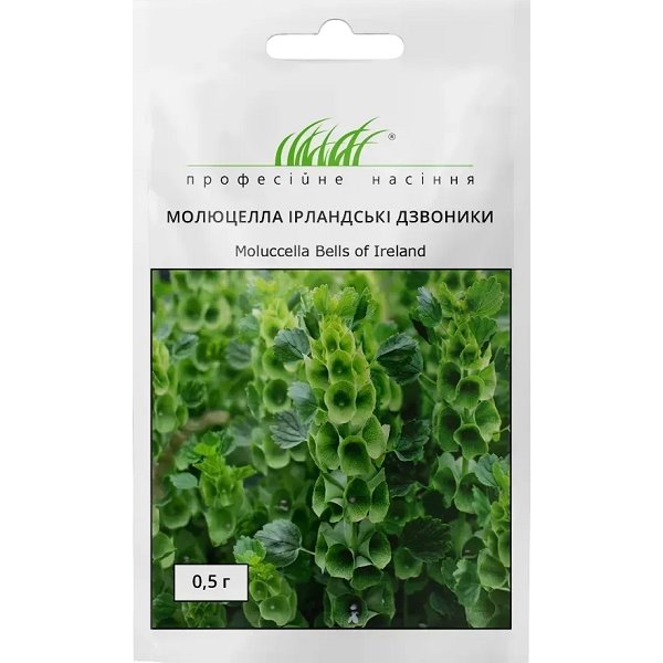 Насіння в пакеті 0,5 гр. Молюцелла Ірландські дзвоники (Moluccella Bells of Ireland). Декоративна рослина, яка додасть легкої екзотичності та кольорового акценту вашому саду. У засушеному вигляді доповнить зимові букети. Рослина висотою до 70 см. Квітки дрібні, білі, ароматні, занурені в блідо-зелену лійковидну чашечку. Цвітіння триває з кінця червня до жовтня. Для молюцелли відводять сонячне або злегка затінене місце, з будь-який добре дренованим ґрунтом. Посів на розсаду в кінці березня – на початку квітня. Сходи з'являються через 20-25 днів. Висадка у відкритий ґрунт після того, як мине загроза заморозків. На постійне місце насіння висівають у травні.