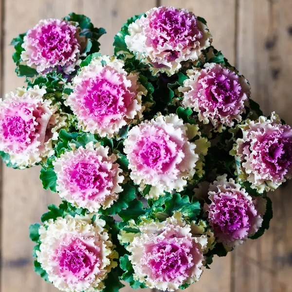 Капуста Крейн Раффл F1 (Brassica oleracea Crane Ruffle F1). Гібрид декоративної капусти з екстравагантним, бахромчастим листям. Вирощують на зріз для створення незвичайних букетів. Висота рослини 60-90 см. Характеризується рівномірним вертикальним ростом стебла та компактними суцвіттями, розмір яких можна регулювати за допомогою відстані між ними. Тривалий час зберігає декоративність у вазі, що робить її чудовим вибором для флористики. Світлолюбива, холодостійка, вологолюбива культура. Віддає перевагу легким, добре дренованим, родючим ґрунтам. На розсаду насіння висівають у кінці березня - на початку квітня, безпосередньо на постійне місце у травні - червні. Догляд за декоративною капустою нескладний і передбачає регулярні поливи, підживлення та розпушування ґрунту при необхідності.