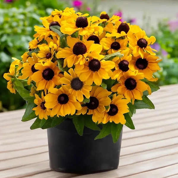 Рудбекія Tablemate Gold, ідеальна для використання як в приміщенні, так і на вулиці. Генетично компактний сорт, висотою лише 20-25 см, рясно вкритий великою кількістю золотистих квітів (діаметром до 5 см) з темною серединкою. Рудбекія стане чудовим подарунком або сонячним доповненням до вашого саду. Ідеальна рослина в горщику, яка прикрасить внутрішні дворики, балкони та підвіконня. Досягаючи ширини приблизно 45 см, рослини створюють повноцінну, пишну композицію навіть у невеликих контейнерах. Період вирощування 15–17 тижнів навесні та лише 14–15 тижнів влітку, що робить її чудовою сезонною рослиною..