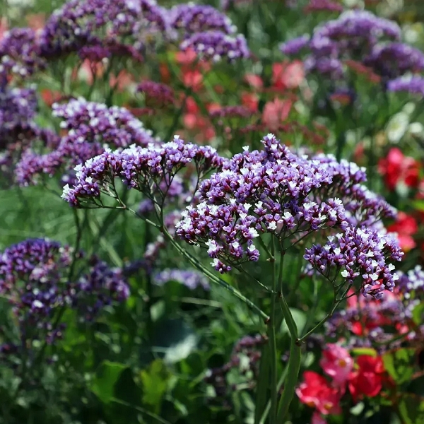 Статиця переса Індія (Limonium perezii Indie). Невибагливий багаторічний вид статиці з насиченими фіолетово-блакитними суцвіттями та широким темно-зеленим листям. Підходить для вирощування в горщиках, озеленення, чудова рослина-сухоцвіт. Пагони високі (до 60 см), що дозволяє включати їх в композиції із зрізаних квітів будь-якої величини. Період цвітіння червень-вересень. Приваблює багатьох корисних комах. Вирощують розсадним способом або безпосередньо у відкритий ґрунт. Від появи сходів до зрізання суцвіть проходить не менше 4 місяців. Молоді рослини висаджують на вулицю тільки в середині літа. Для сушіння квіти зрізують в період повного цвітіння.